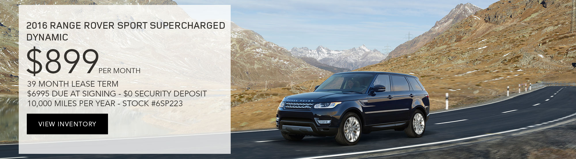 $899 per month plus tax and fees with $6,995 due at signing. $0 security deposit with approved credit. 2016 Range Rover Sport Supercharged Dynamic. #6SP223. 10,000 miles per year. 39 month lease. Photo is for illustration purposes only. All vehicles subject to prior sale. Subject to finance approval by lender. Must present web special for this pricing. Please contact Land Rover Nashville Sales Department for qualifications and complete details. For special lease terms, take new delivery by 12/31/16.