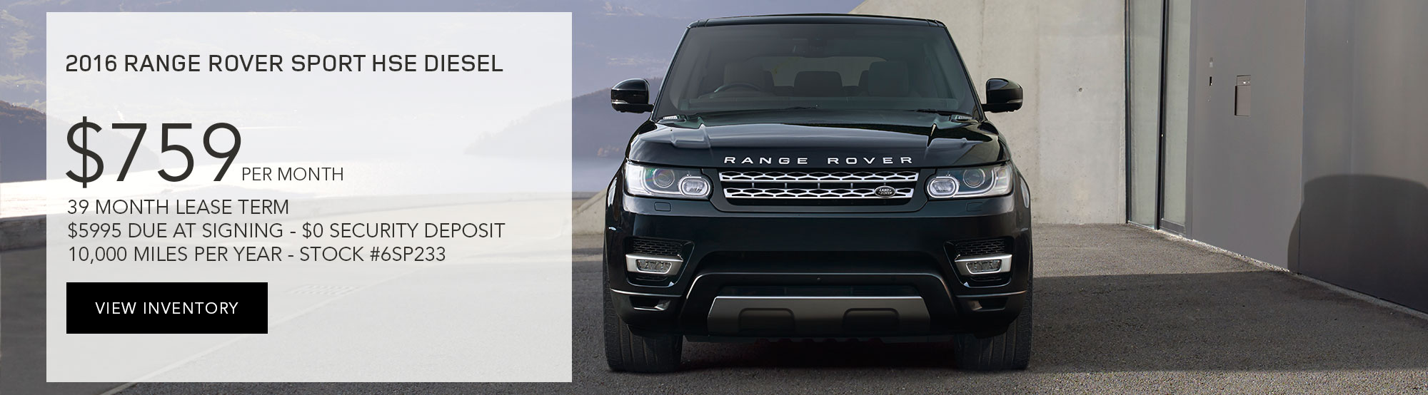 $799 per month plus tax and fees with $5,995 due at signing. $0 security deposit with approved credit. 2016 Range Rover Sport HSE Diesel. #6SP233. 10,000 miles per year. 39 month lease. Photo is for illustration purposes only. All vehicles subject to prior sale. Subject to finance approval by lender. Must present web special for this pricing. Please contact Land Rover Nashville Sales Department for qualifications and complete details. For special lease terms, take new delivery by 12/31/16.Â