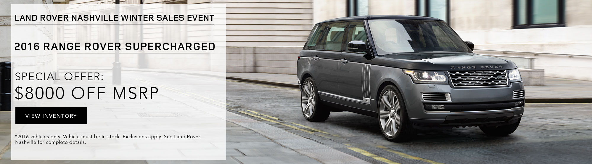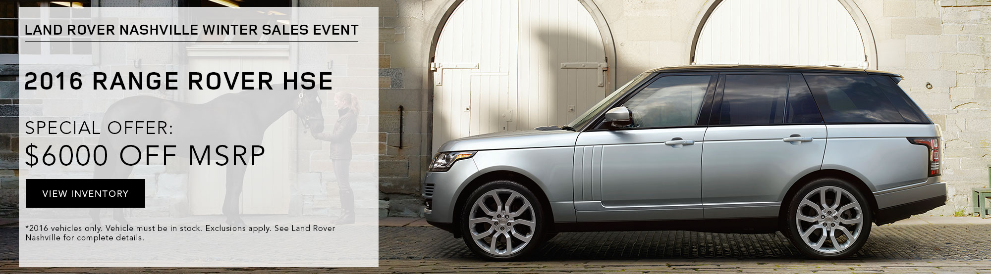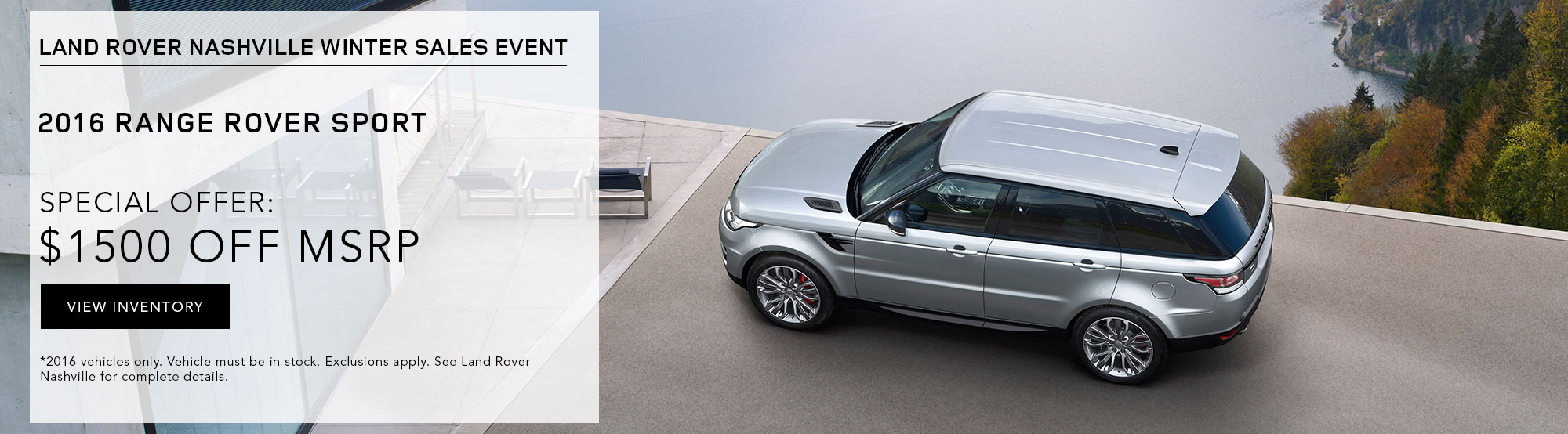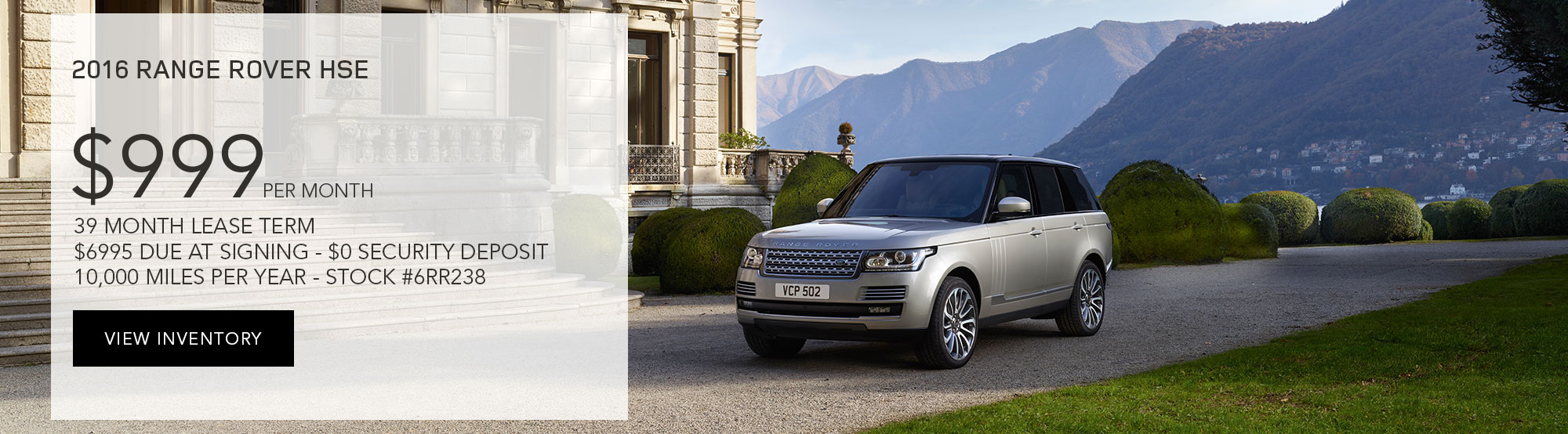 $999 per month plus tax and fees with $6,995 due at signing. $0 security deposit with approved credit. 2016 Range Rover HSE. #6RR238. 10,000 miles per year. 39 month lease. Photo is for illustration purposes only. All vehicles subject to prior sale. Subject to finance approval by lender. Must present web special for this pricing. Please contact Land Rover Nashville Sales Department for qualifications and complete details. For special lease terms, take new delivery by 12/31/16.Â