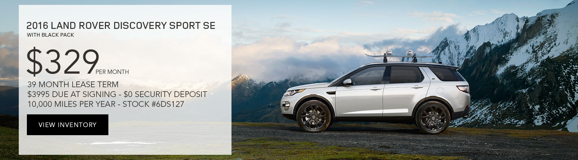 $329 per month plus tax and fees with $3,995 due at signing. $0 security deposit with approved credit. 2016 Land Rover Discovery Sport. #6DS127. 10,000 miles per year. 39 month lease. Photo is for illustration purposes only. All vehicles subject to prior sale. Subject to finance approval by lender. Must present web special for this pricing. Please contact Land Rover Nashville Sales Department for qualifications and complete details. For special lease terms, take new delivery by 12/31/16.