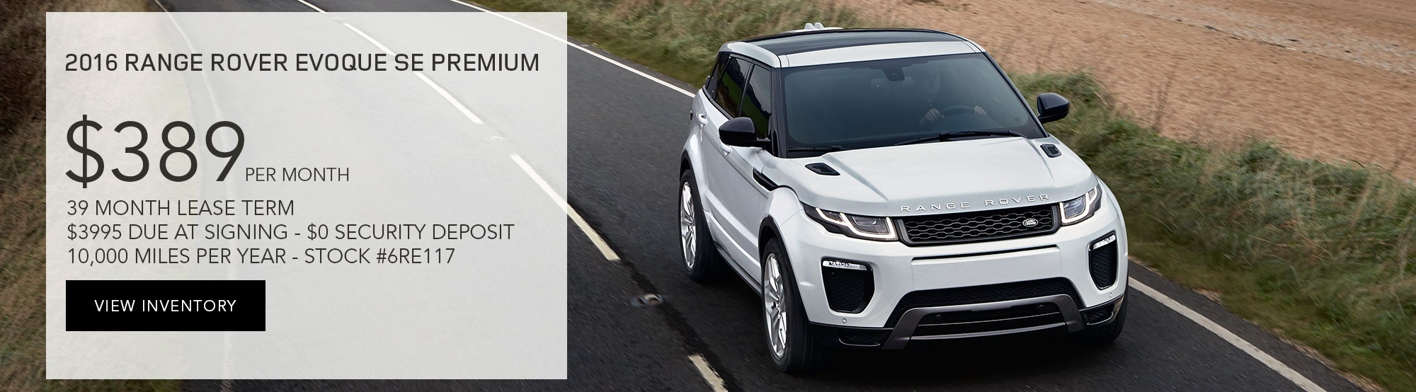 $389 per month plus tax and fees with $3,995 due at signing. $0 security deposit with approved credit. 2016 Range Rover Evoque SE Premium. #6RE117. 10,000 miles per year. 39 month lease. Photo is for illustration purposes only. All vehicles subject to prior sale. Subject to finance approval by lender. Must present web special for this pricing. Please contact Land Rover Nashville Sales Department for qualifications and complete details. For special lease terms, take new delivery by 12/31/16.Â